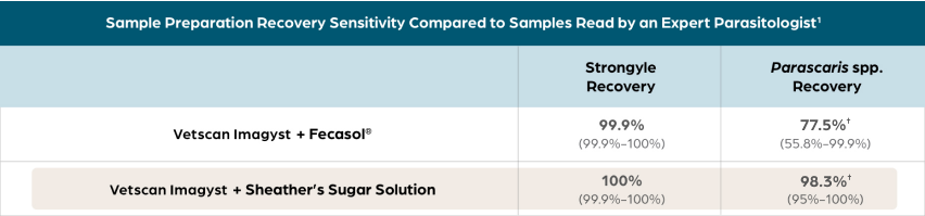‡ Vetscan Imagyst + Sheather’s sugar solution vs expert parasitologists.
